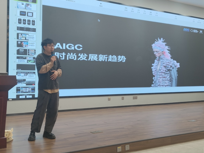 讲座中,刘一行总经理围绕AI服装设计应用现状展开分享,系统梳理了当下AI技术在服装设计领域的发展脉络与应用场景。他结合行业前沿动态,详细介绍了多款AI工具,全方位拆解了AI工具在设计全流程中的实操方法,让在场师生直观感受到AI技术为服装设计带来的效率革新与创意突破。他指出,AIGC时代对设计师提出了全新要求——交互型、复合型人才正成为行业主流,AI不是创意的替代者,而是帮助设计师整理思路、增强设计效果的有力工具,设计师的核心竞争力在于掌握科学的设计方法与深度的设计认知,并针对AI时代设计师的核心能力升级、创意边界拓展等问题,为师生们提供了极具指导性的思路。